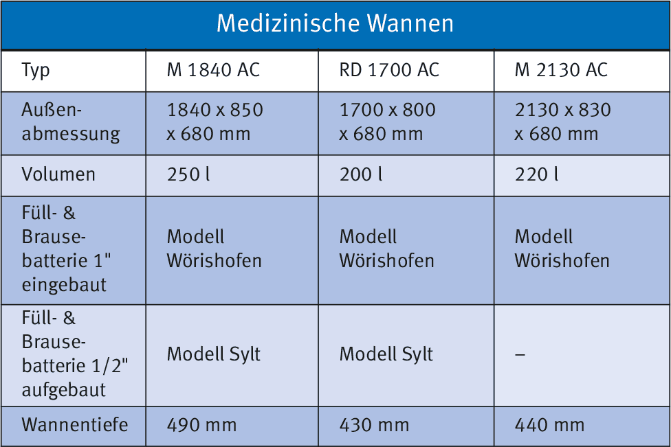 Die Unterwasser- und Kombinationsanlagen Wörishofen und Boppard können mit verschiedenen Bausteinen ausgestattet werden: Unterwassermassage (UW), elektrogalvanische Steuerung für die Stangerbadtherapie (GI) und CO2-Trockengasbadeteil. Die Anlagen entsprechen dem Medizinproduktegesetz und garantieren eine einfache und komfortable Bedienung.